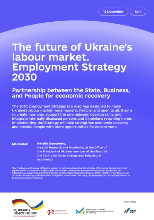 The 2030 Employment Strategy is a roadmap designed to make Ukraine's labour market more modern, flexible, and open to all. It aims to create new jobs, support the unemployed, develop skills, and integrate internally displaced persons and Ukrainians returning home. Implementing the Strategy will help strengthen economic recovery and provide people with more opportunities for decent work.